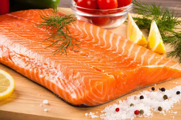 Stor helside (ca 1kg) med ovnsbakt laksefilet, med Gla’laksens fiskekrydder. Fileten blir pyntet på fat, klar til servering og leveres med kaviardressing ved siden av.